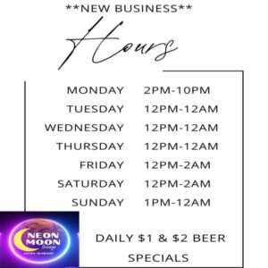 Back to School Bash – August 9th @ 5 pm. Food truck and Live Music Once Again Get Fried and Two for Smoking Play Again! Prize for Best Dressed for the Luau! Make sure to follow the Neon Moon – Leeds, Alabama page for daily and monthly event updates!