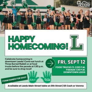 Homecoming is this Friday! 🏈 Come out and celebrate in downtown Leeds! Grab lunch at a food truck or The Three Earred Rabbit-Leeds before the parade at 1:30 p.m. đŸ„ Shop local at our downtown businesses, and don’t forget to grab your foam hands for the big game against Lincoln at 7:00 p.m. at Homer Smiles Stadium! https://facebook.com/leedsmainstreet