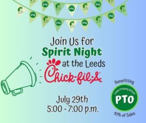 We love our community, and we are so thankful for Chick-fil-A Leeds to support the LPS PTO!Go ahead and ✅ your 🗓️ and ✏️ it in. 10% of sales go back to the LPS PTO. One less night you need to plan dinner! It’s that easy!
