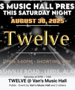 August 30 @9pm! 21+ show! $8 cover! Fans say TWELVE is one of the better party bands around. They play a wide variety of southern rock, old country, R&B and alternative (including some originals). Their goal is for YOU to have a great time. Van’s Music Hall