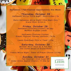 Remember Leeds Downtown Trick or Treat is this Friday, October 29 from 3-5p. Check out the Leeds Halloween / Fall Festival Opportunities this week: Don’t miss a single minute of fun in Leeds, Alabama this week! Thursday, October 28 Halloween Horror Movie Trivia Night-Rails and Ales Get ready to show your stuff as Pop Culture…